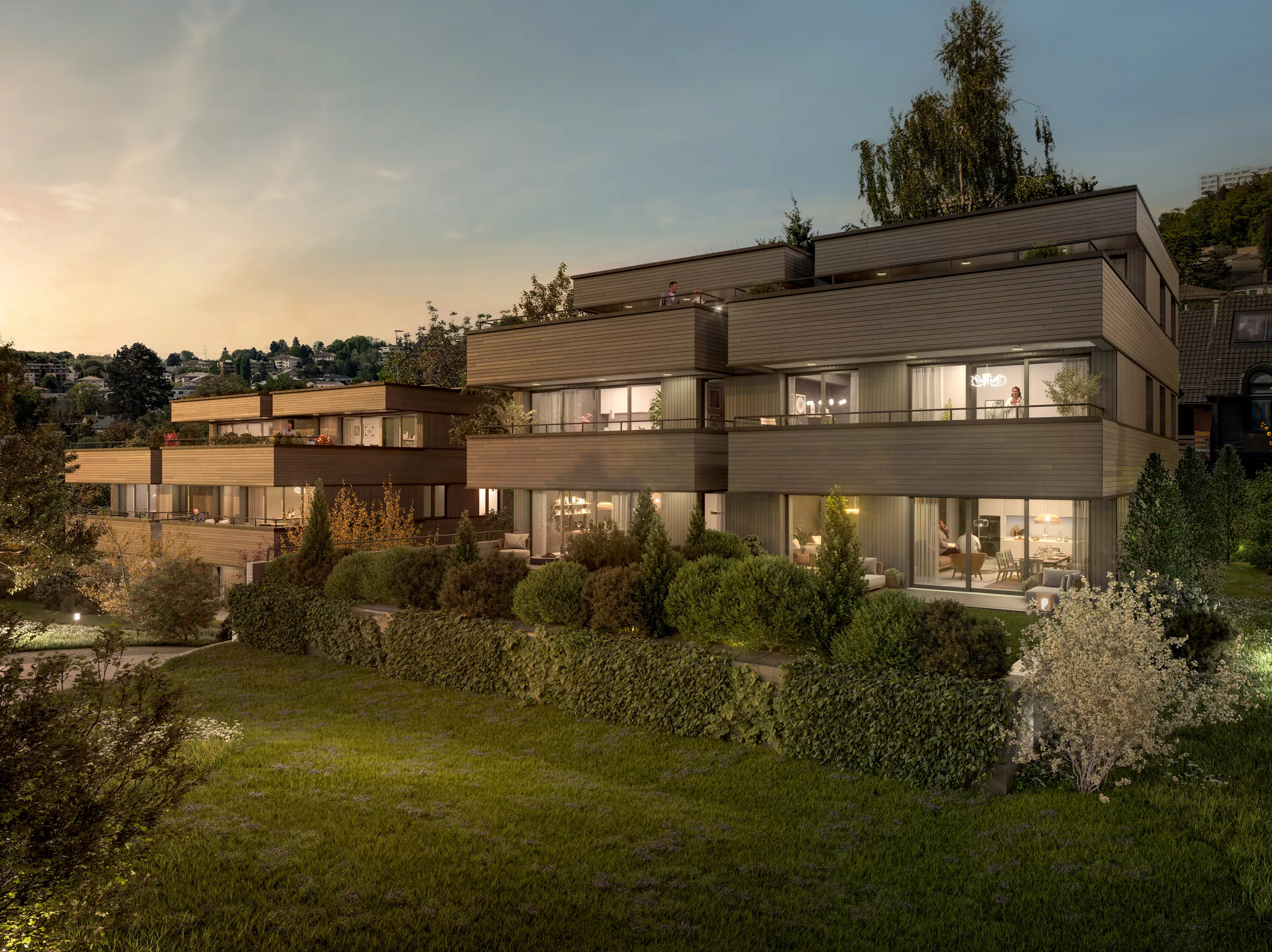 Chaque appartement dispose d’une place de parc et d’un jardin privé ou d'une spacieuse terrasse offrant une vue dégagée sur le quartier et les Alpes. Ces espaces extérieurs sont des lieux parfaits pour vous détendre et profiter des douces journées ensoleillées.